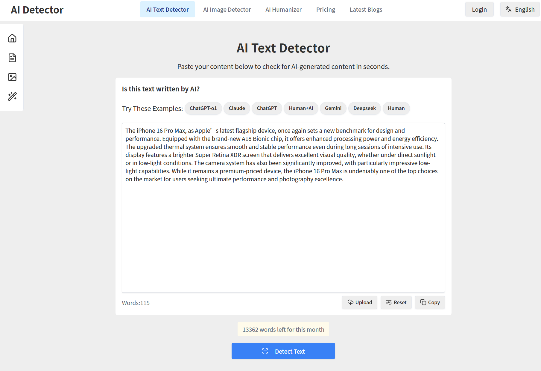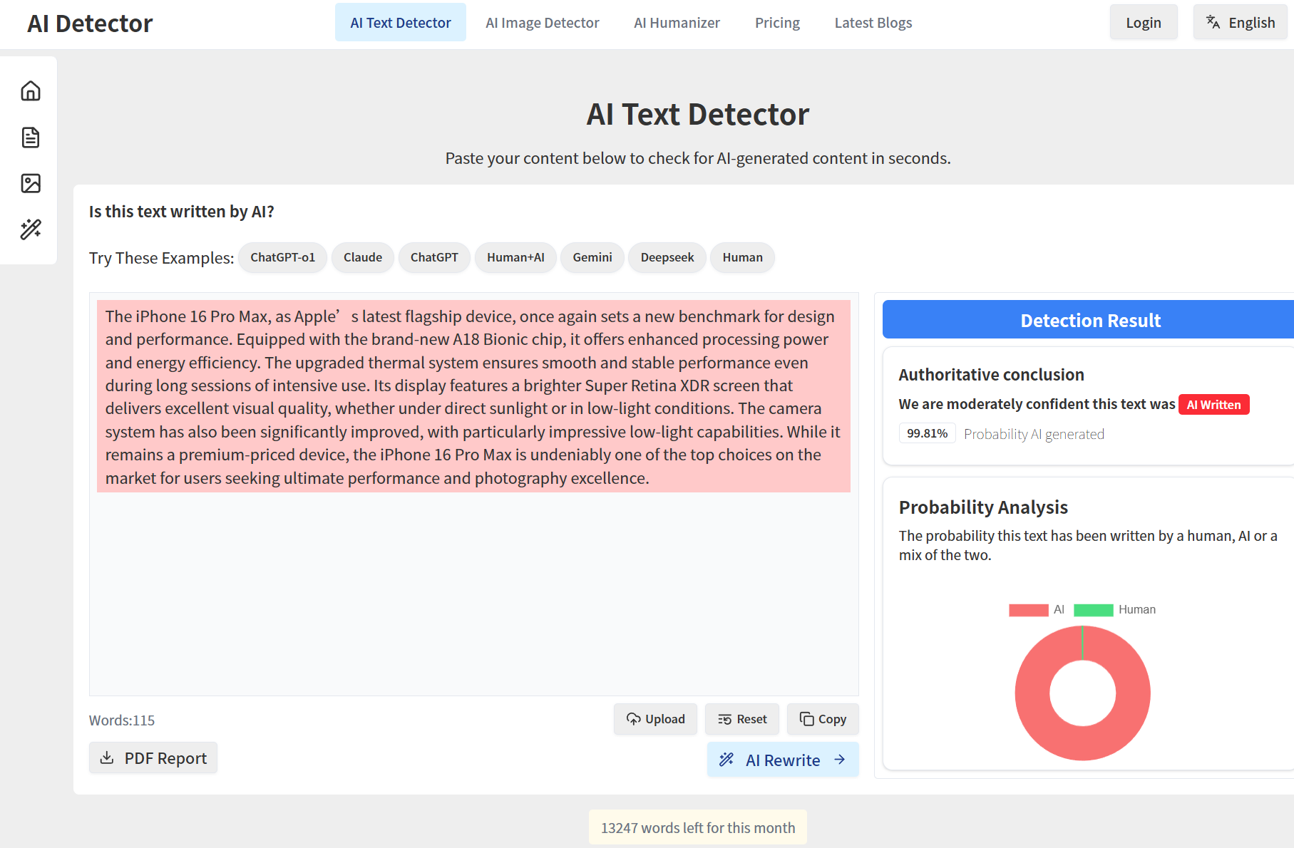If a text is detected by AI Detector as AI-generated, if you don’t believe the result, you can use another tool to detect it, combining multiple tools to get the result.