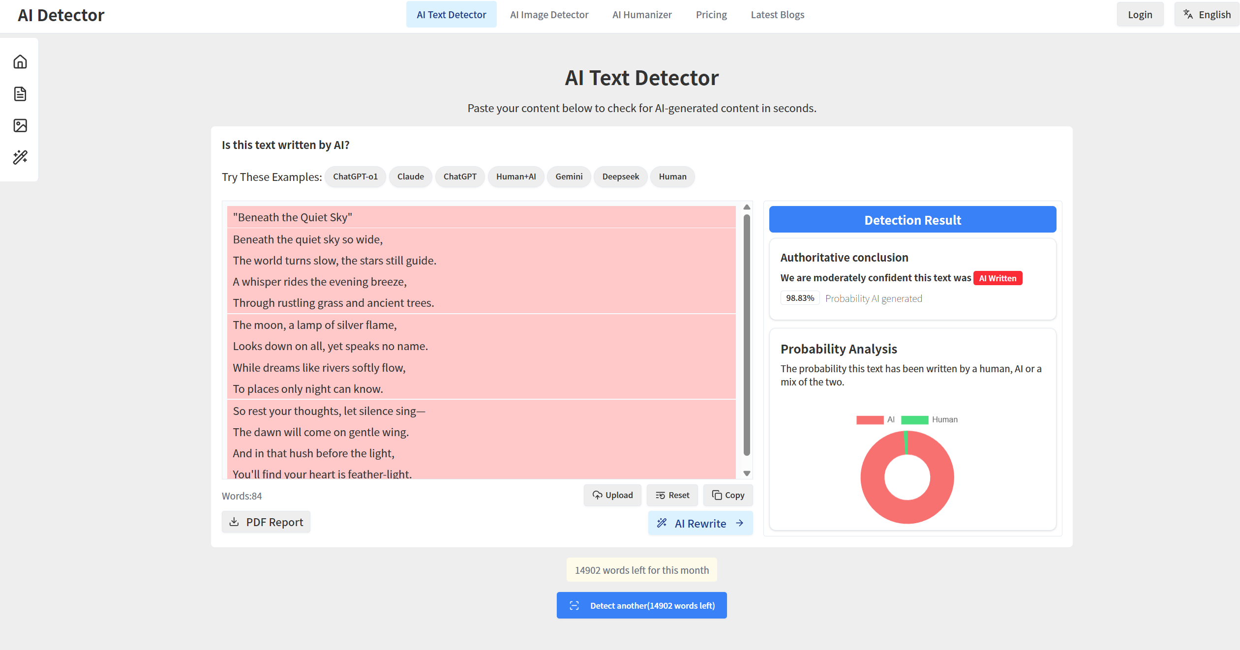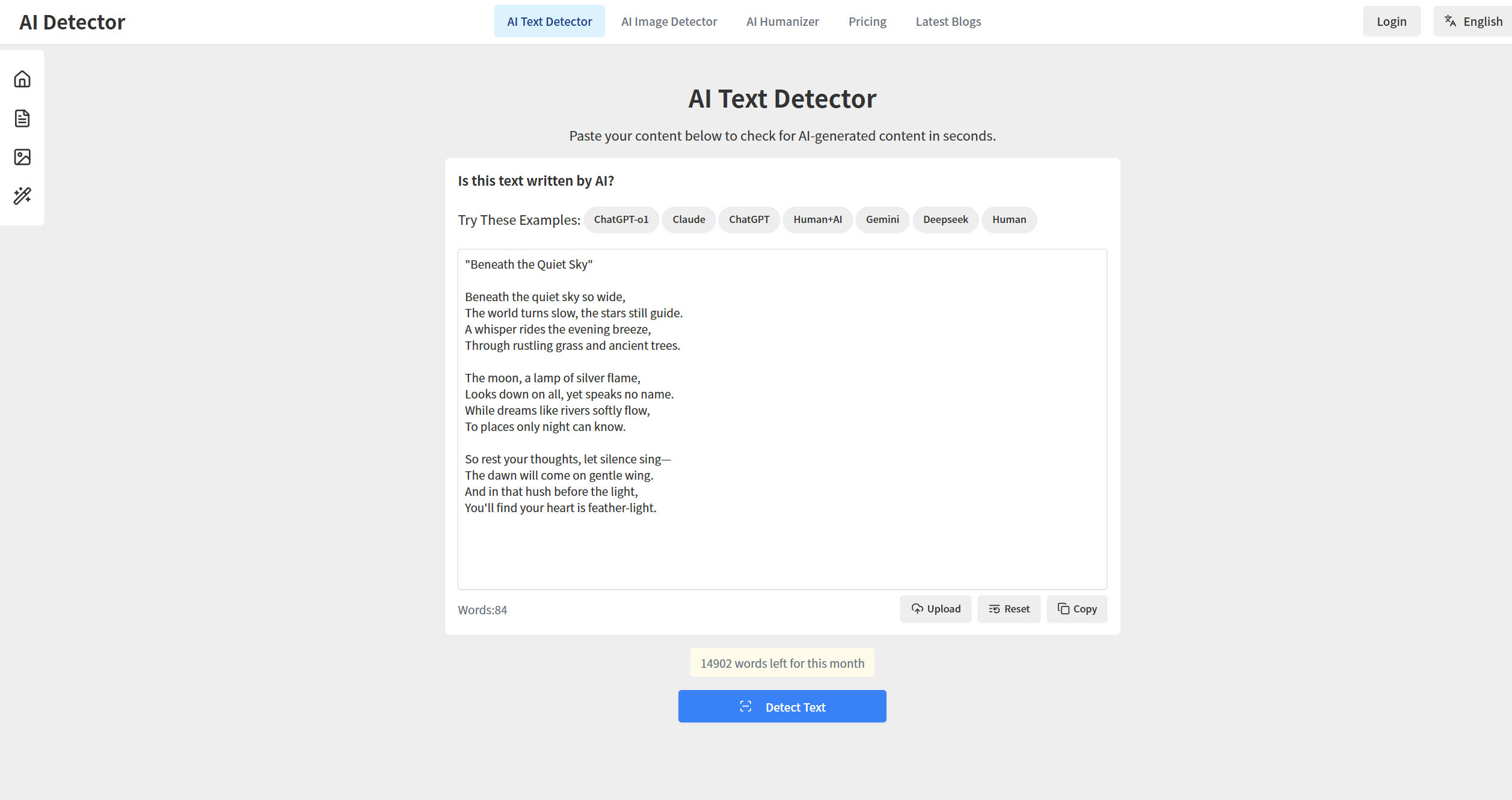Visit GPTdetect.ai and upload your text(Use ChatGPT to generate poems as an example)