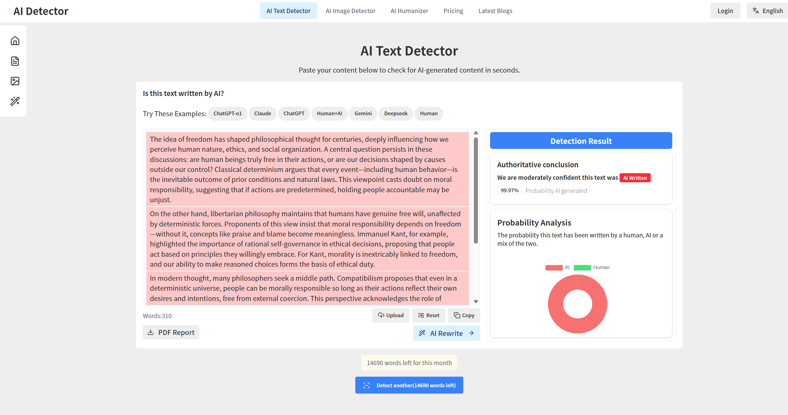 However, the content rewritten by AI Humanizer can still be detected on GPTDetect.ai, and it can still help detect it. Just: